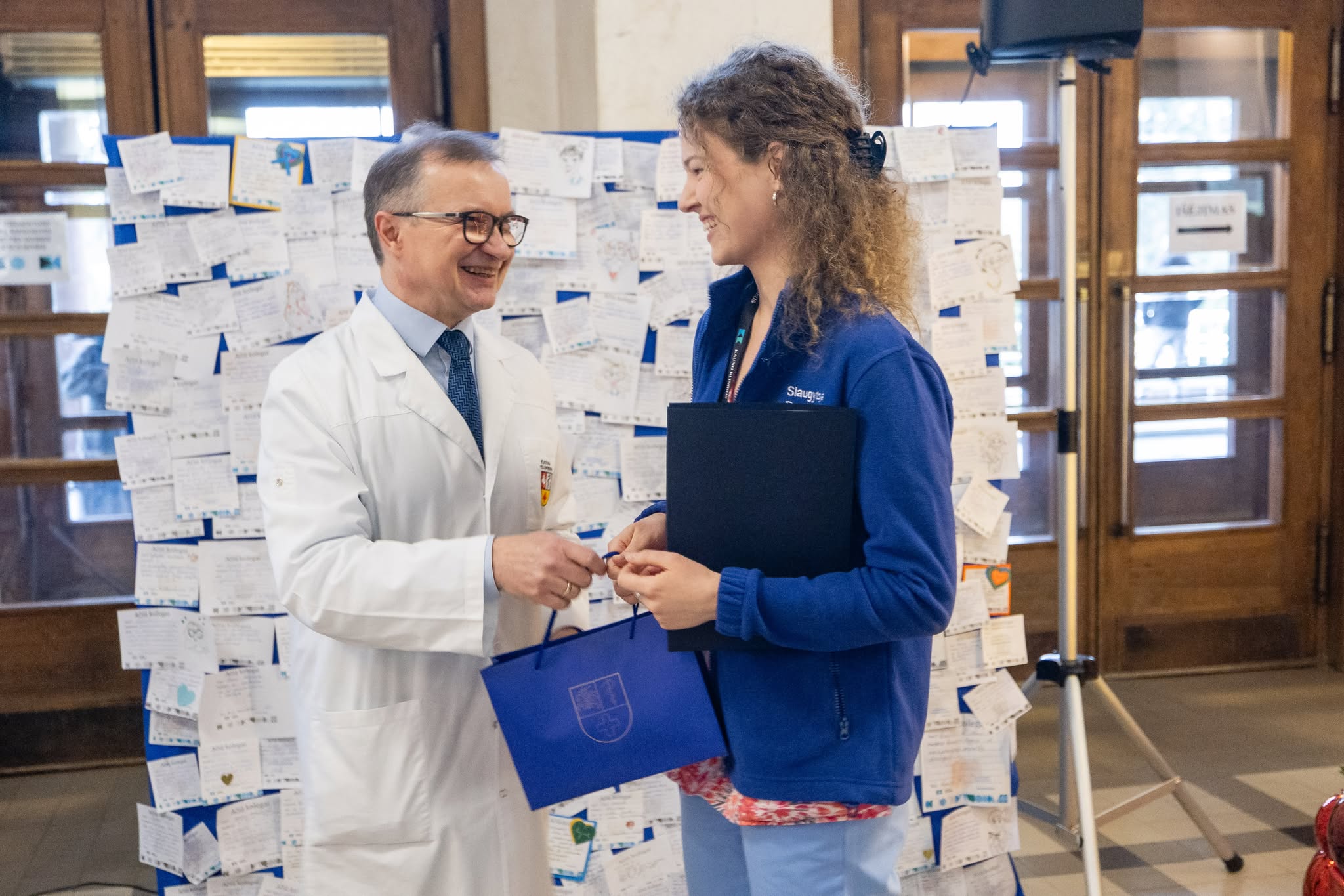 Rasa Šuminskienė, Kauno klinikų Endokrinologijos klinikos vyr. slaugytoja-slaugos administratorė, šiemet savo kolegoms skyrė daugiau nei šimtą padėkų. Pasak jos, iniciatyva suteikia progą sustoti, pažvelgti į nuveiktus darbus ir įvertinti šalia buvusius žmones. „Kiekvieną padėką rašiau labai sąmoningai – galvodama apie žmogų, su kuriuo teko dirbti, kuris buvo šalia ir nepamiršo palaikyti sunkiomis akimirkomis. Tai ne šiaip žinutės – tai padėkos už tikrus, svarbius žmogiškus gestus“, – pasakoja R. Šuminskienė.