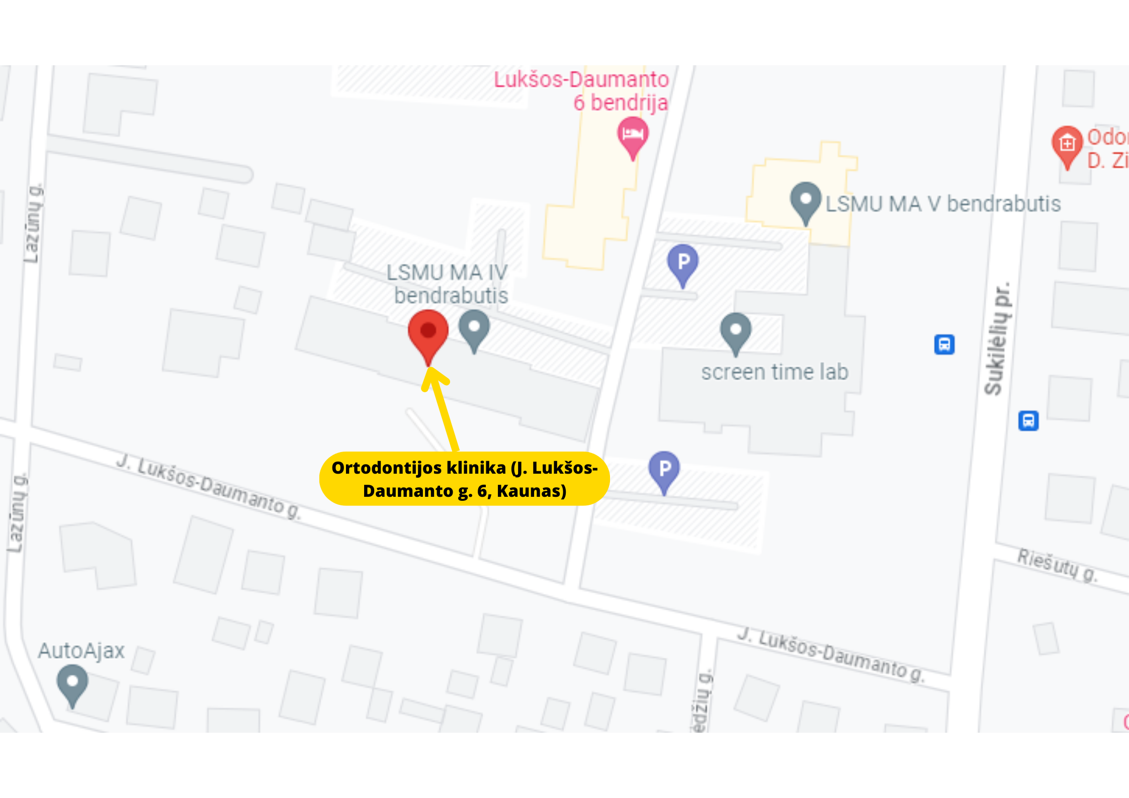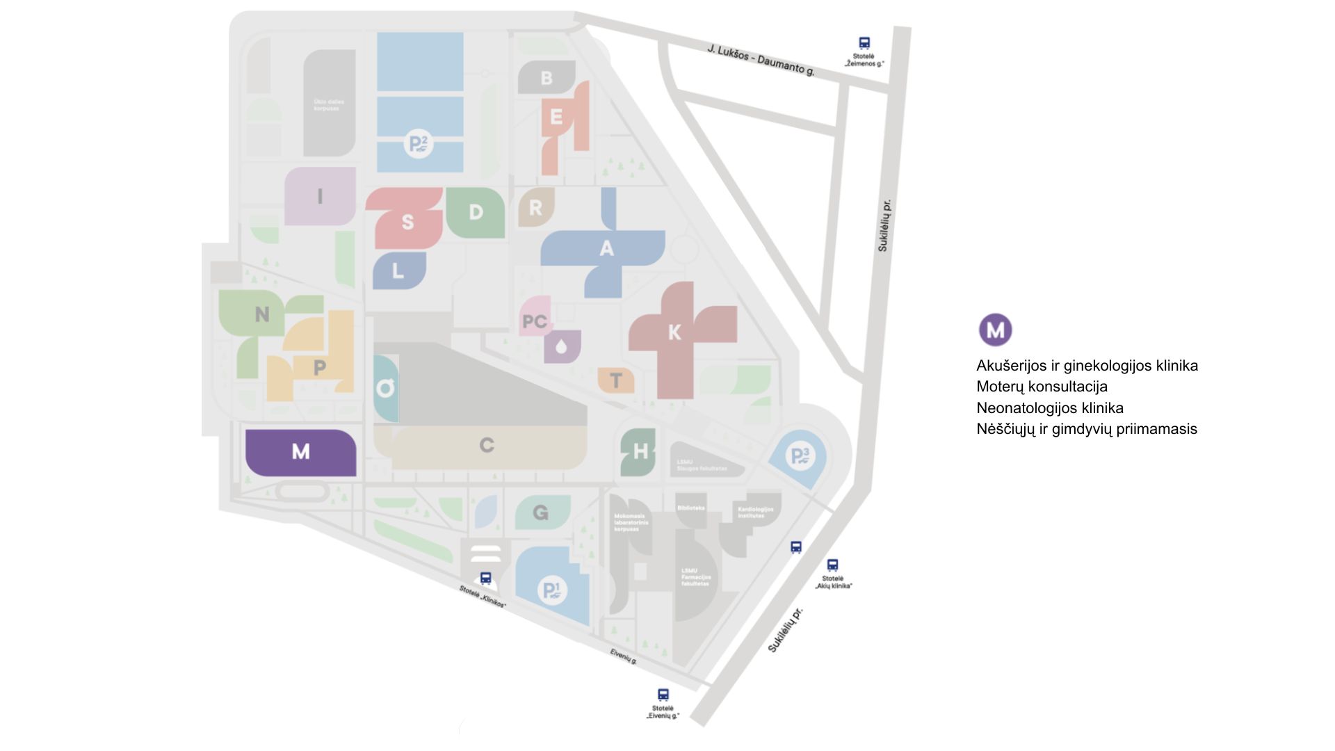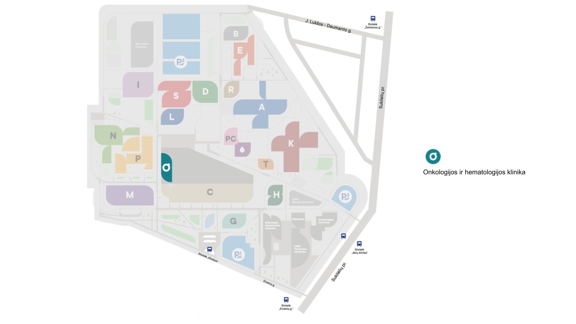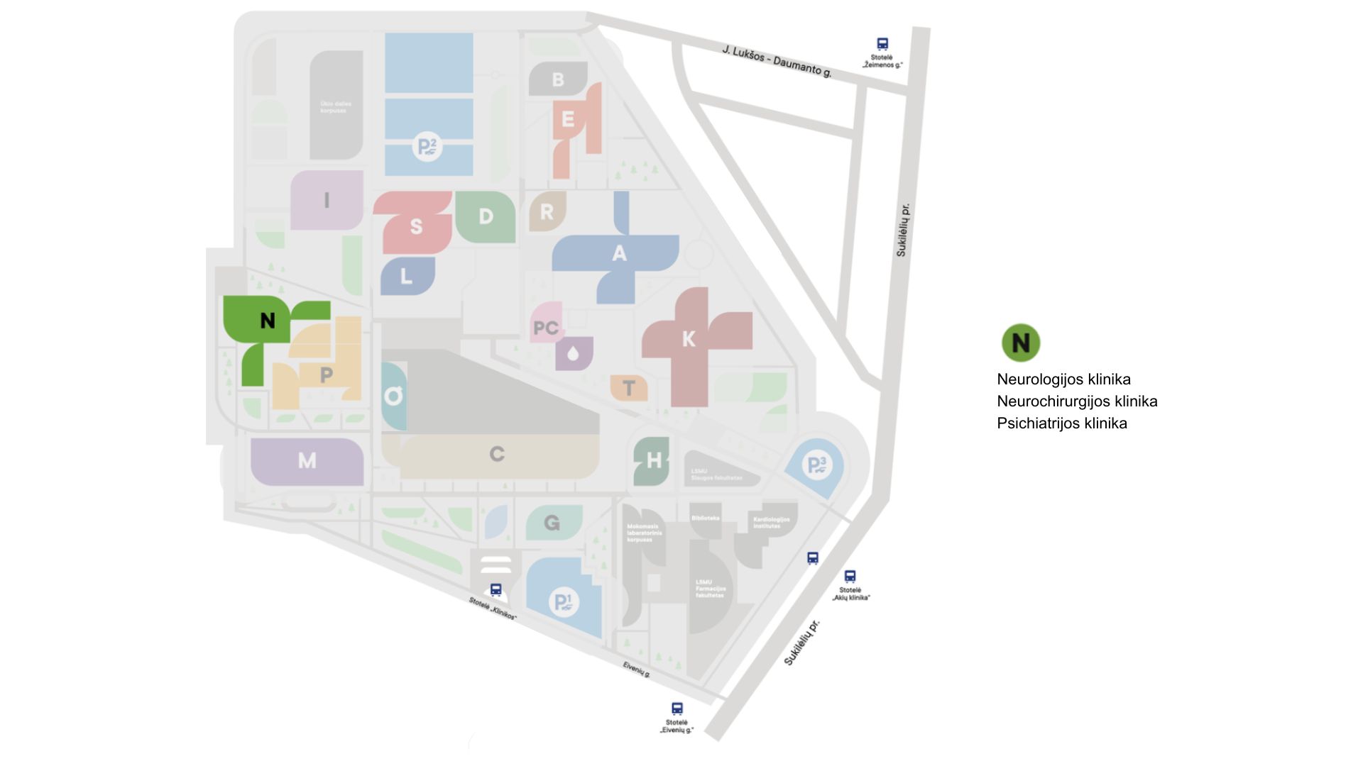 Kauno klinikų teritorijos planas, autobusiuko maršrutas payžmėtas mėlynai.