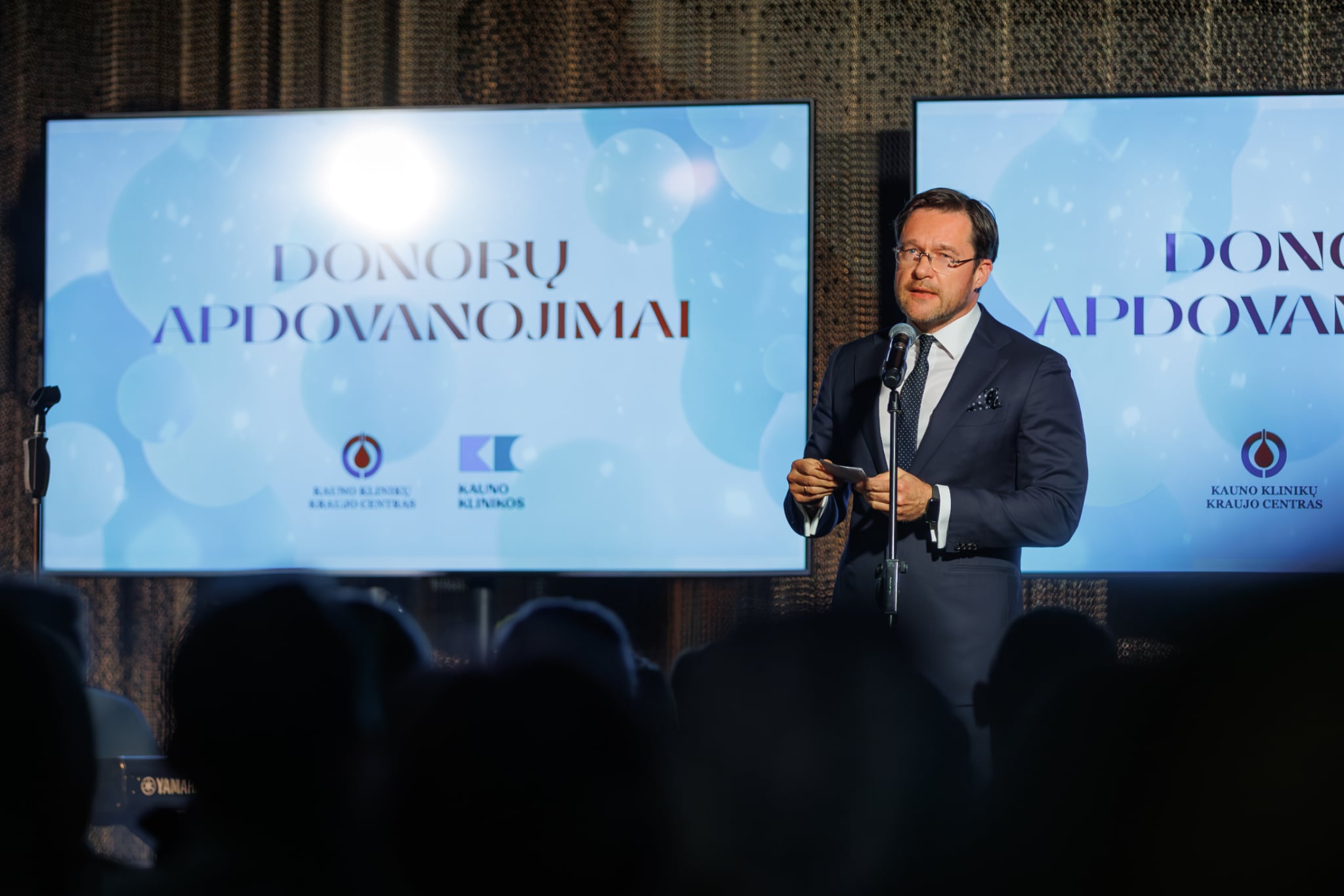 „Šiandien – ypatinga diena. Tai ne tik oficialus renginys, bet ir nuoširdi padėkos išraiška jums – kraujo donorams, kurie tyliai, be didelių žodžių, kasdien dovanojate gyvybę. Jūsų auka – tai viltis, tai šviesa, sužibanti žmogui pačioje tamsiausioje gyvenimo akimirkoje, net jei jis niekada nesužinos, iš kur ta šviesa atėjo“, – sveikindamas susirinkusiuosius kalbėjo prof. Kęstutis Stašaitis, Kauno klinikų direktorius medicinai ir slaugai.