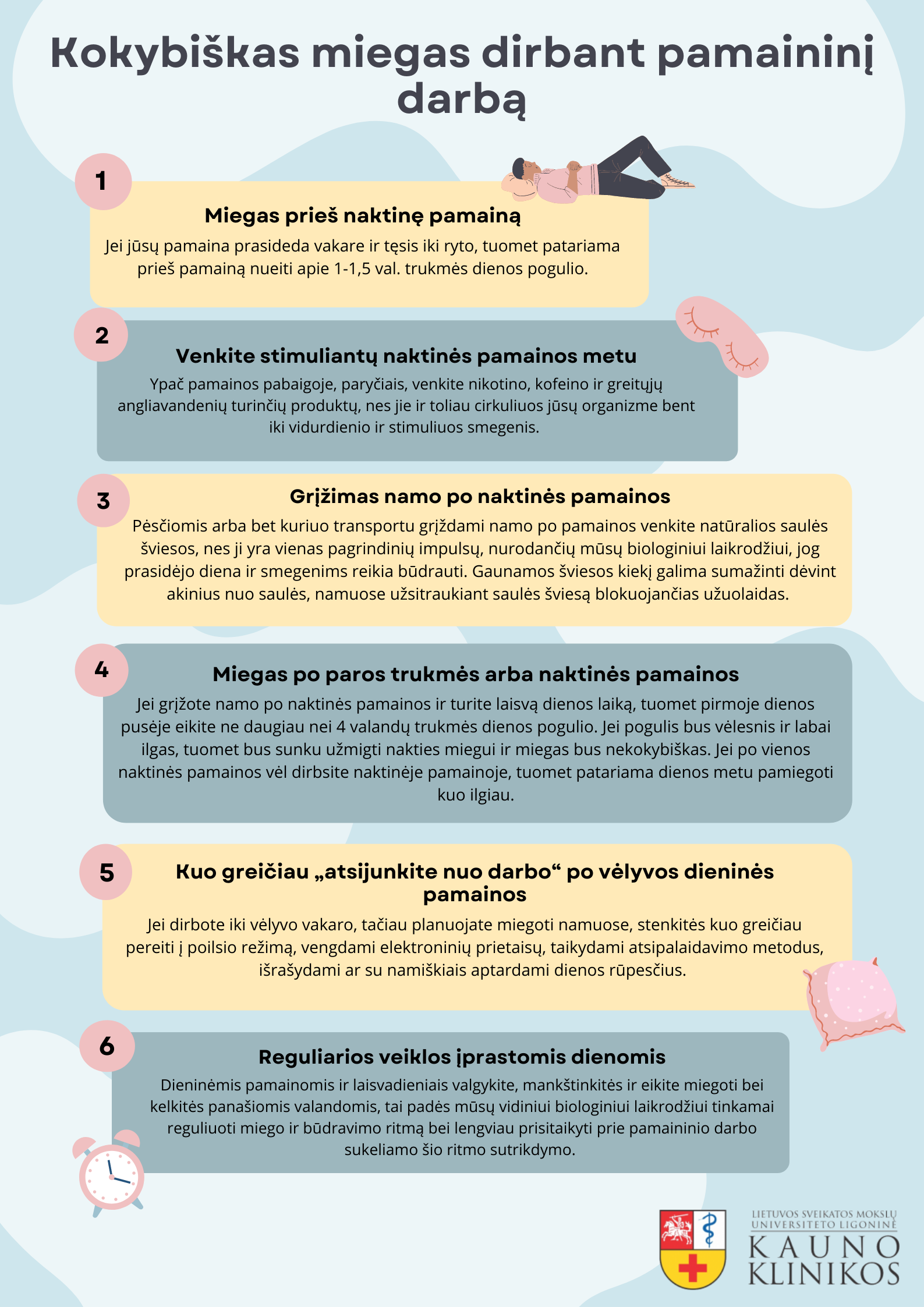 Siekiant pagerinti miego ir būdravimo ritmą, dirbant pamaininį darbą, Kauno klinikų gydytojai neurologai rekomenduoja atkreipti dėmesį į poilsį prieš naktinę pamainą. „Pamainai prasidedant vakare ir tęsiantis iki ryto, darbuotojams patariama prieš pamainą apie valandą ar pusantros valandos skirti miegui, – teigia gydytoja neurologė. – Be to, grįžus iš naktinės pamainos ir turint laisvą dieną, pirmoje dienos pusėje reikėtų skirti ne daugiau nei 4 valandas poguliui. Jei pogulis bus vėlesnis ir ilgesnis, naktį gali būti sunku užmigti, o miegas taps nekokybiškas.“ Ji priduria, kad jei po vienos naktinės pamainos reikės dirbti ir kitą naktį, tada patariama dienos metu miegoti kuo ilgiau.
