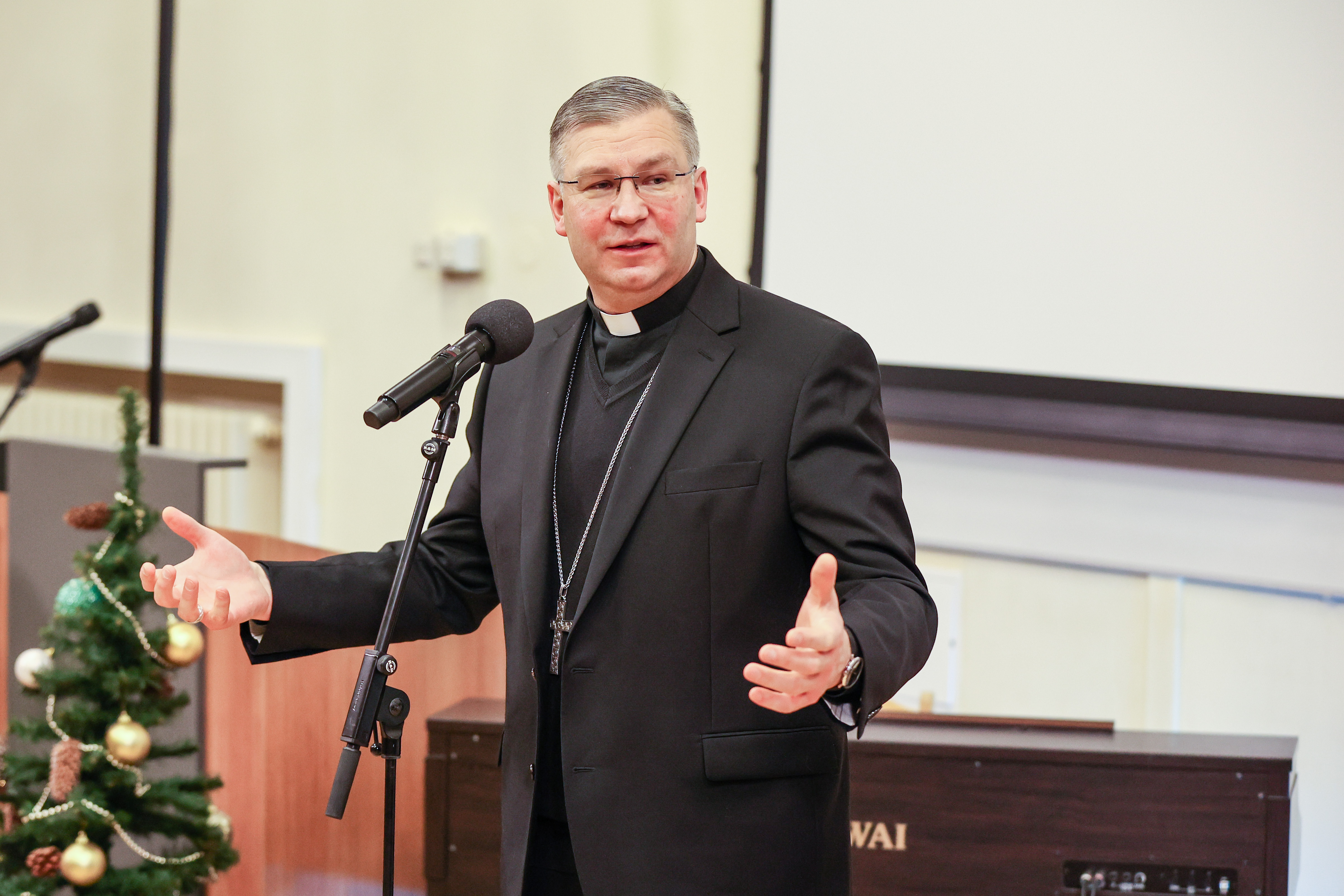 Sveikinimo žodį taręs Kauno arkivyskupas metropolitas dr. Kęstutis Kėvalas paminėjo, kad žvelgti į medikų bendruomenę jam – tarsi dovana. „Jūs pacientams ne tik padedate pasveikti, bet ir nuraminate sunkiausiomis akimirkomis, – sakė K. Kėvalas. – Linkiu, kad kiti metai būtų džiaugsmingi, suteiktų įkvėpimo toliau tęsti savo misiją ir dovanoti viltį.“