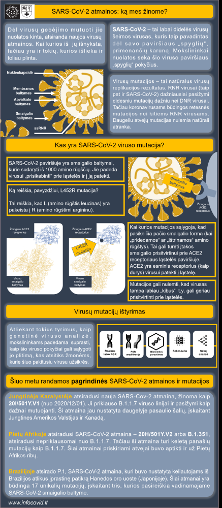 Daugiau apie SARS-CoV-2 viruso mutacijas galite skaityti ekspertų informaciją: https://www.infocovid.lt/straipsniai ir https://bit.ly/3qfQwSj