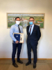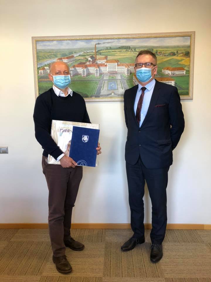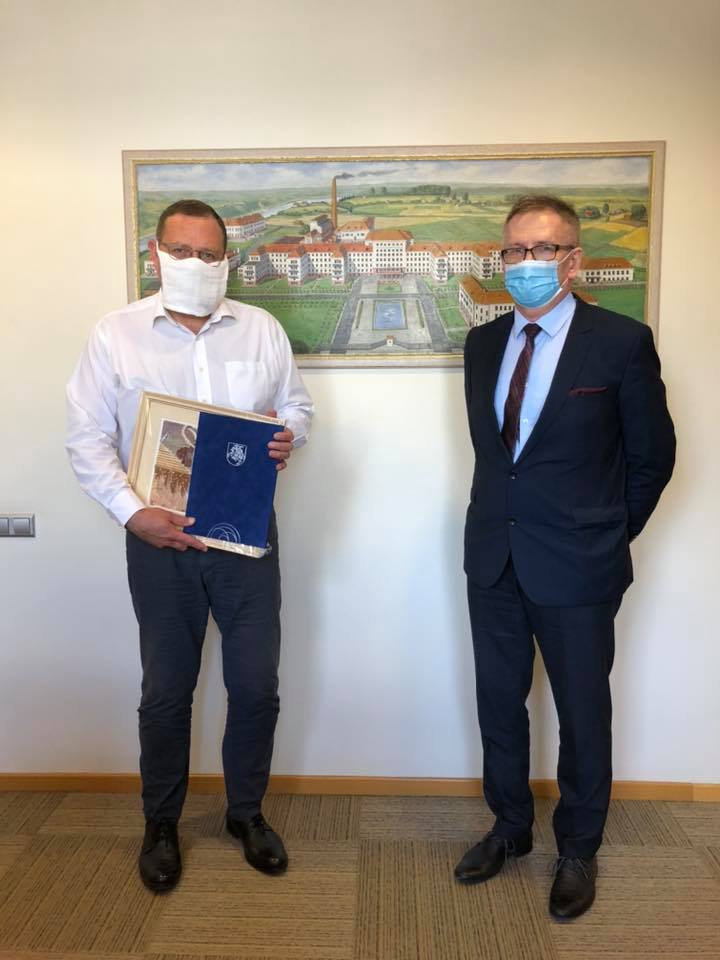 Šiandien Kauno klinikose apsilankęs Ministro pirmininko Sauliaus Skvernelio patarėjas sveikatos apsaugos klausimais doc. Jonas Kairys doc. Kęstučiui Stašaičiui, direktoriui medicinai ir slaugai ir Skubiosios medicinos klinikos vadovui, Šarūnui Mačinskui, Ambulatorinių paslaugų koordinavimo tarnybos vadovui ir prof. Dinui Vaitkaičiui, Lietuvos sveikatos mokslų universiteto Ekstremaliosios medicinos katedros vedėjui, įteikė padėkas nuo Premjero už profesionalumą, pareigingumą bei operatyvų darbo organizavimą ekstremaliosios situacijos dėl COVID-19 metu.