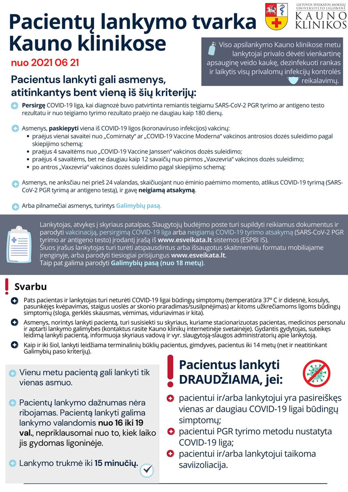 Kauno miesto savivaldybėje naujų COVID-19 ligos atvejų skaičiui 100 tūkstančių gyventojų esant mažiau nei 100, nuo šiandien, birželio 21 dienos, Kauno klinikose pacientus galima lankyti vadovaujantis šia tvarka. Nuo šiandien pacientų lankymo dažnumas nėra ribojamas. Pacientus galima lankyti ne tik darbo dienomis, bet ir savaitgaliais (lankymo valandomis nuo 16 iki 19 val.).