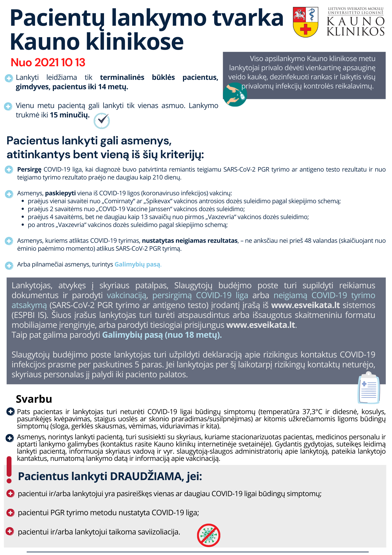 Nuo spalio 13 dienos Kauno klinikose keičiasi pacientų lankymo tvarka. Lankyti leidžiama tik terminalinės būklės pacientus, gimdyves ir pacientus iki 14 metų.