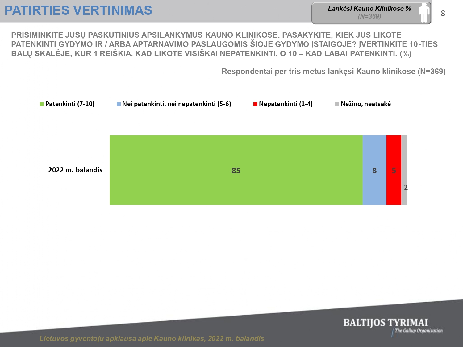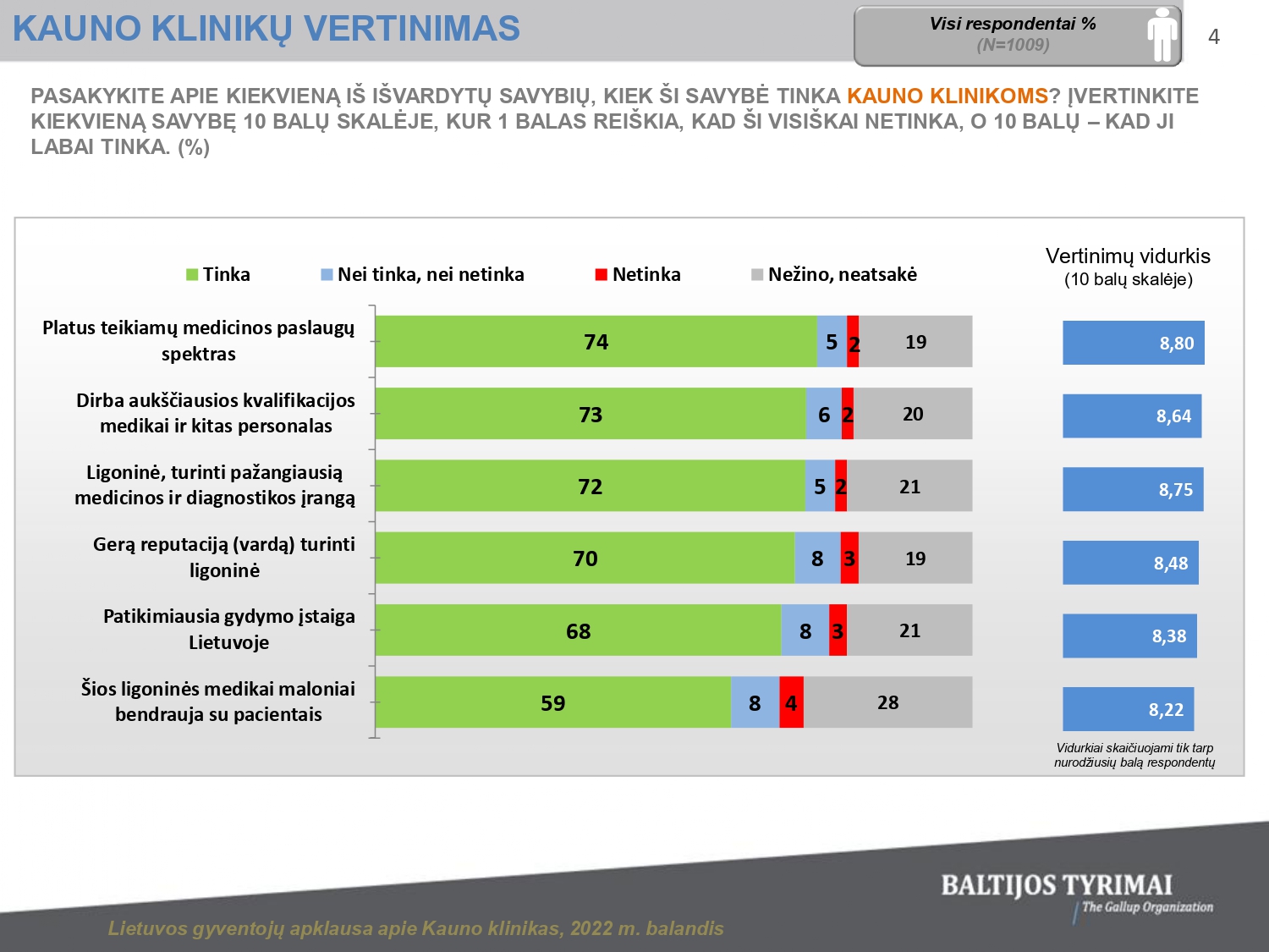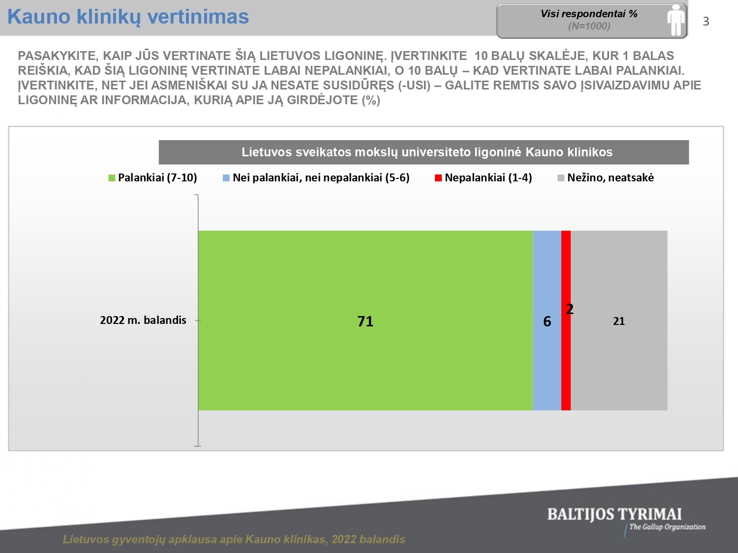 Bendrovės vadovė priduria, kad šis neigiamas emocinis fonas daro įtaką daugeliui kitų vertinimų, pavyzdžiui, valstybės institucijų, įstaigų, ateities perspektyvų vertinimui. „Pažymėtina, kad Kauno klinikų vertinimui šie bendri nuotaikų pokyčiai įtakos nepadarė – vertinimas per trejus metus išliko stabiliai pozityvus“, – teigia R. Ališauskienė. 2022 m. Kauno klinikas palankiai vertina trys iš keturių apklaustųjų (71 proc.), o nepalankiai – vos 2 proc. Kas penktas gyventojas nuomonės šiuo klausimu neturi.