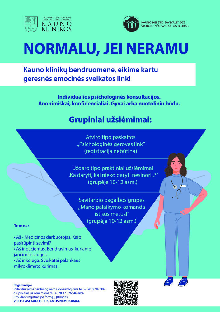 Visi Kauno klinikų darbuotojai gali registruotis į nemokamas psichologo konsultacijas, kurios vyksta kontaktiniu būdu Kauno klinikų Vaikų reabilitacijos klinikoje (naujas pastatas tarp Vaikų ligų ir Psichiatrijos klinikų. Įėjimas pro Vaikų ligų kliniką), konsultacijos trukmė – 50 minučių.