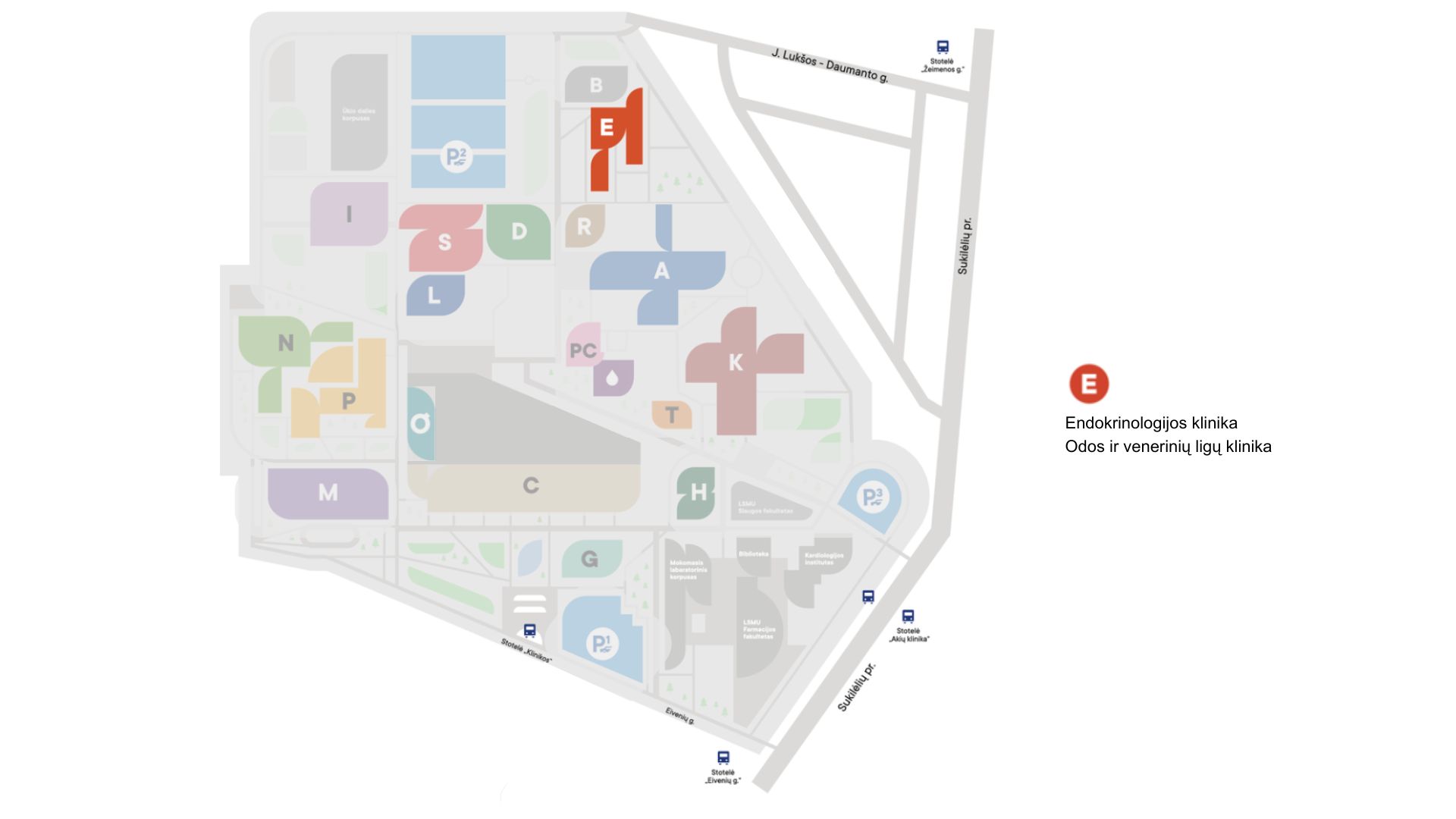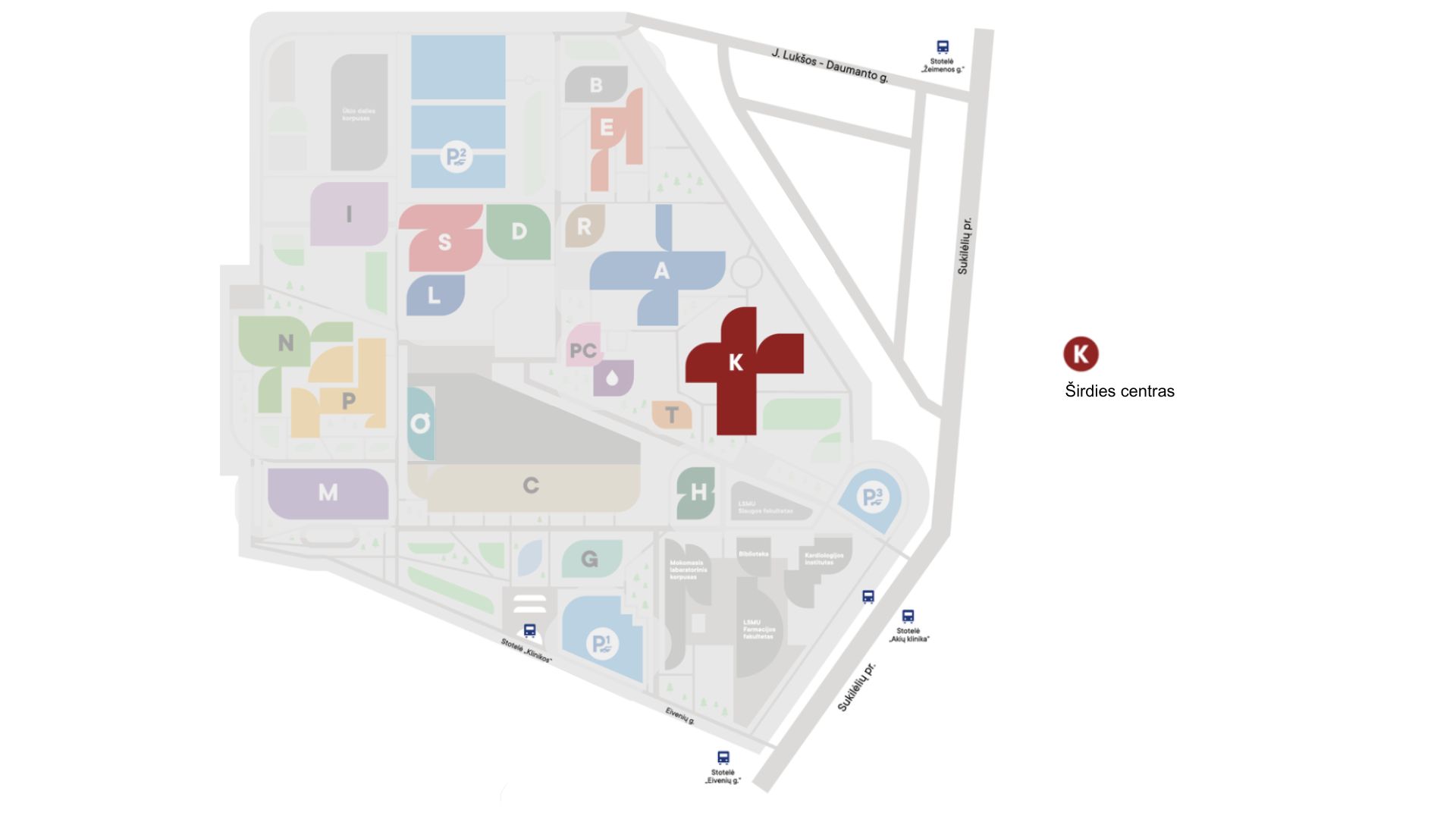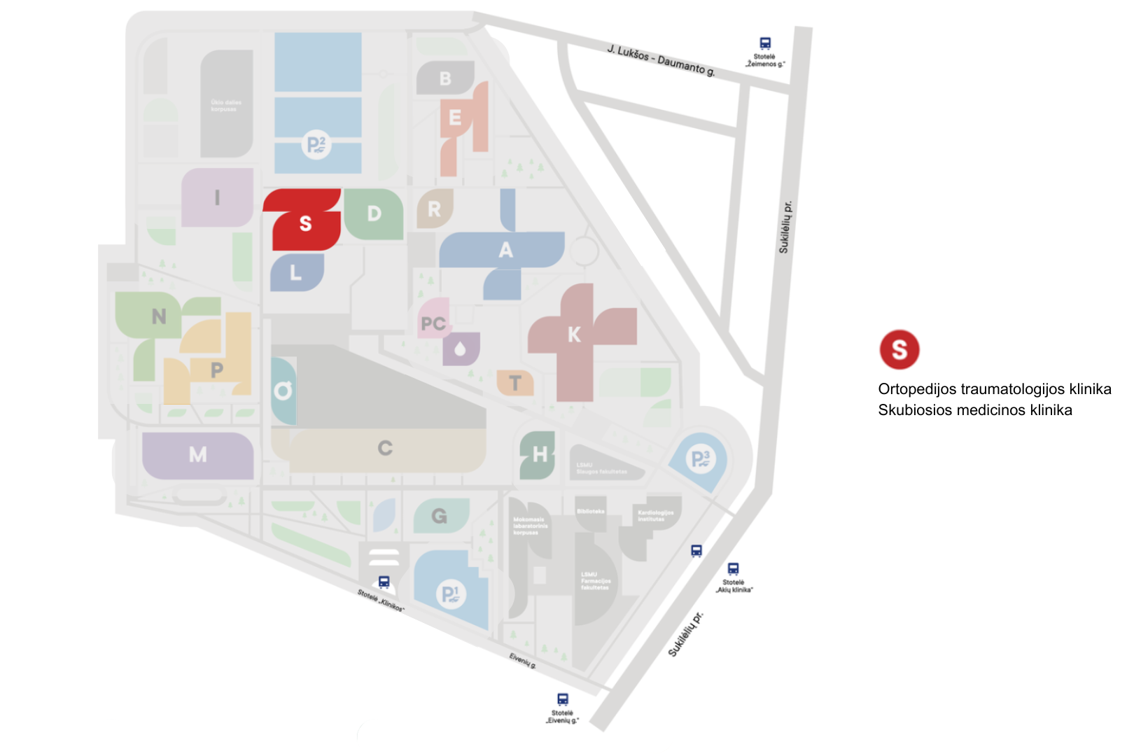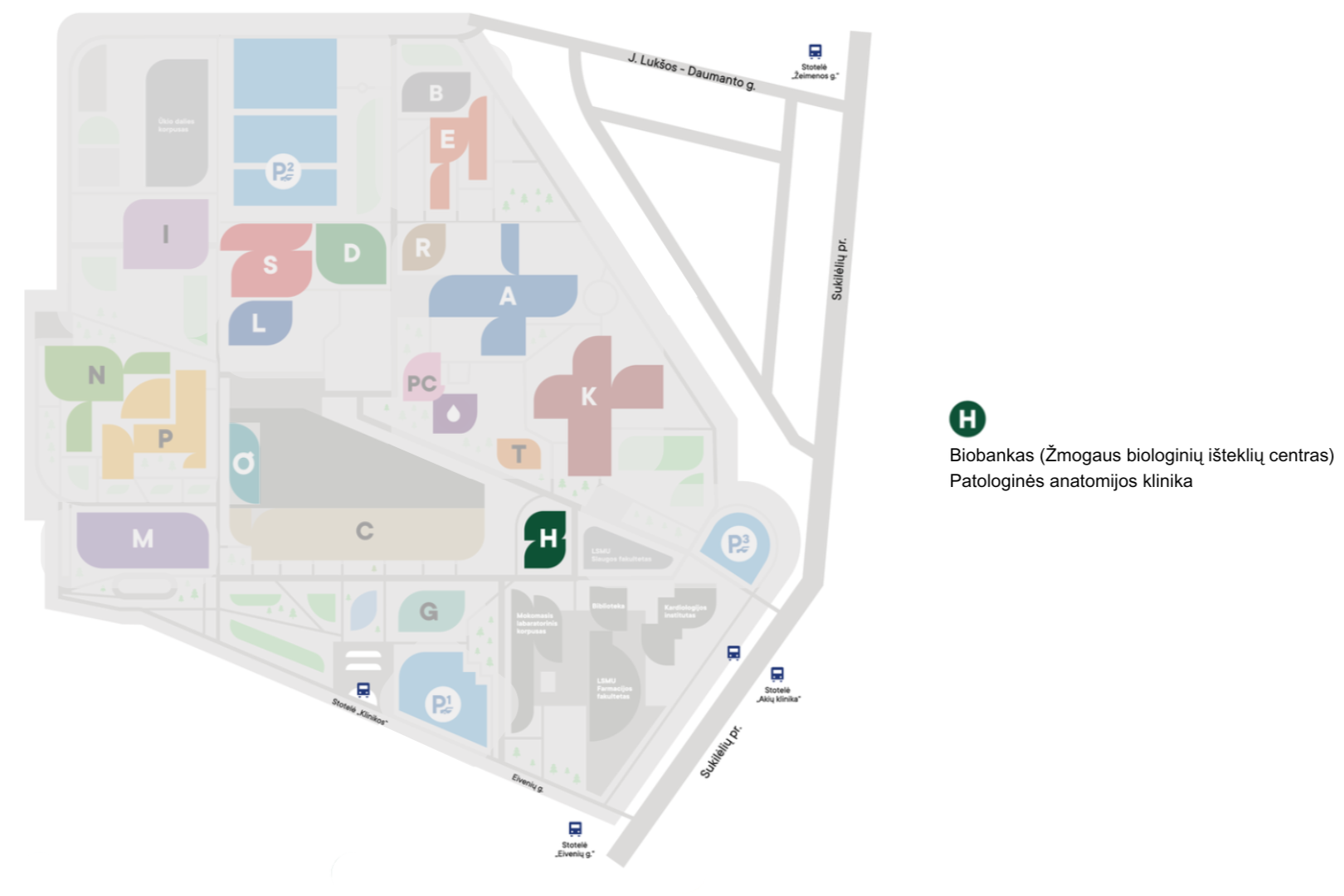 Kauno klinikų teritorijos planas, autobusiuko maršrutas payžmėtas mėlynai.